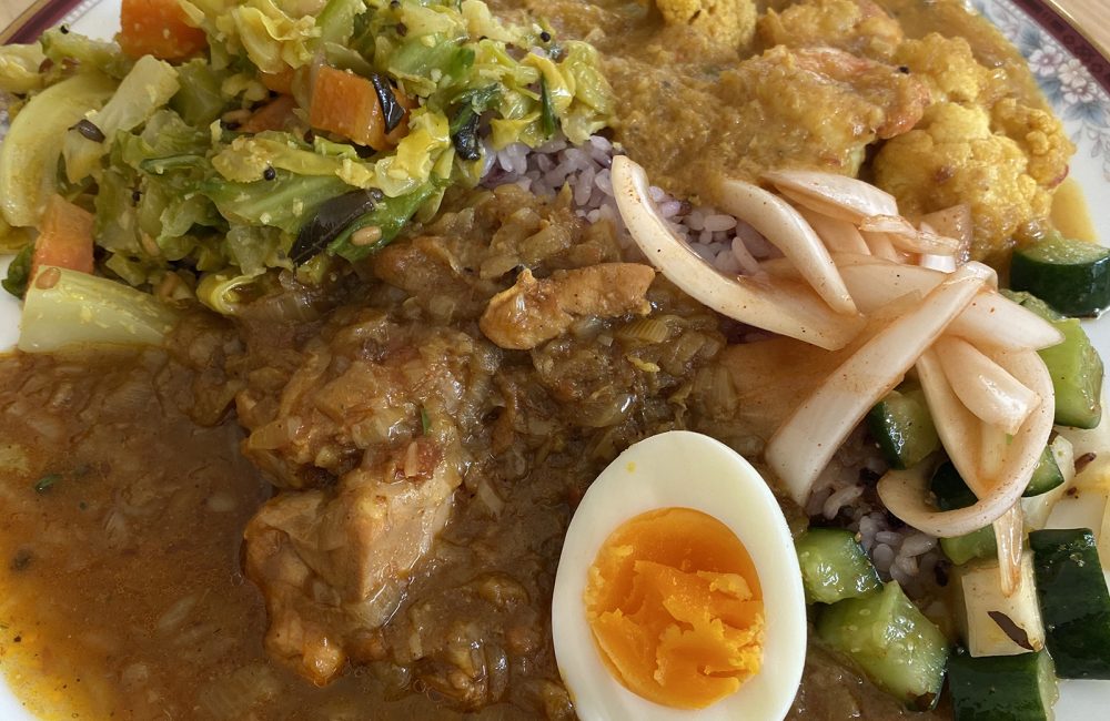 有吉シェフの人柄もあり、お客さんと和やかに話が弾み、みなさんから再来を熱望されてました。プレートのご飯には、私たちがいづりはで無農薬無肥料栽培したキヌヒカリに、在来種の香りもち米『ちこもち』と黒米もミックス。美味しくスパイシーなカレーで、お米の甘みも引き立ちました。