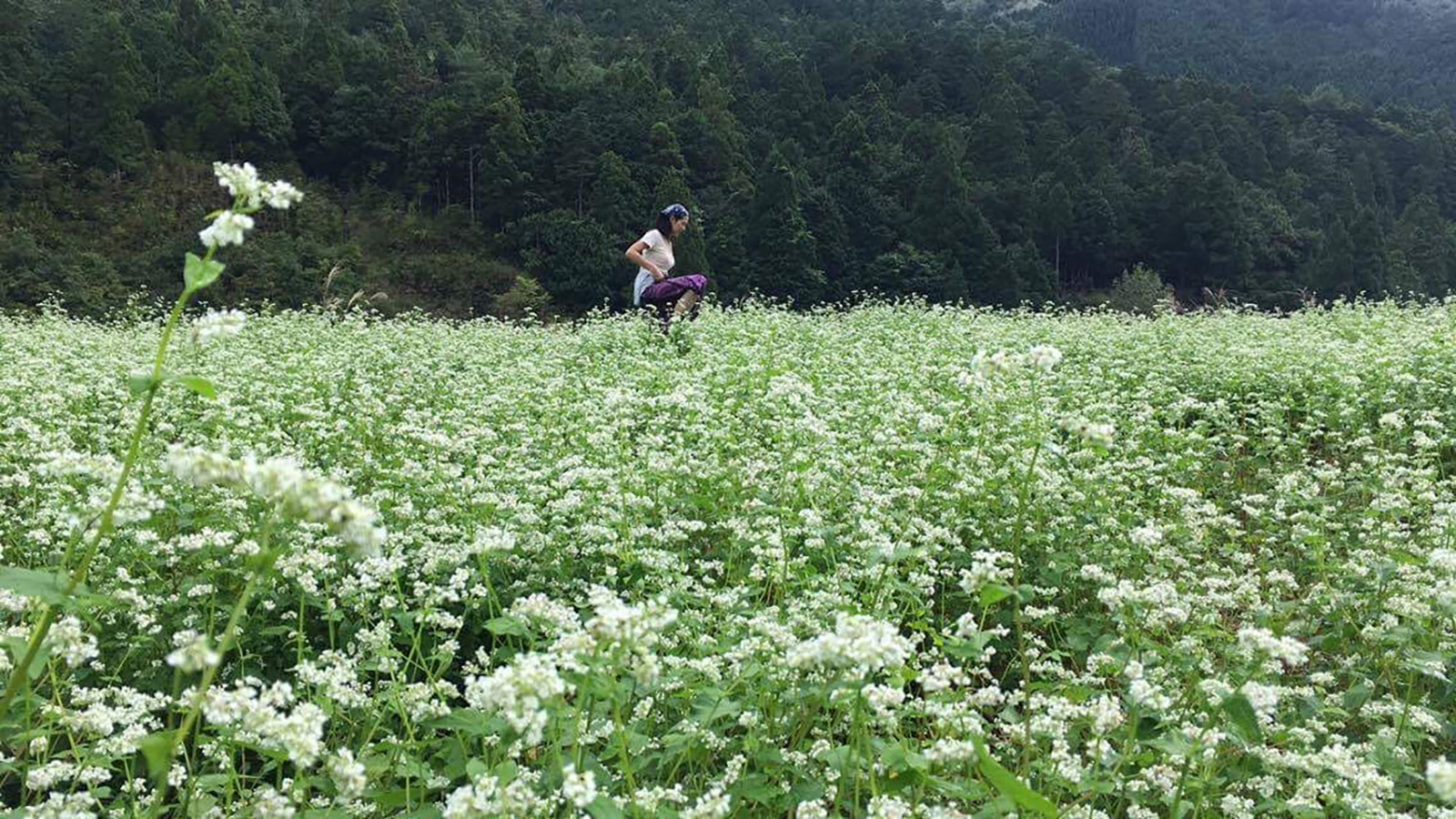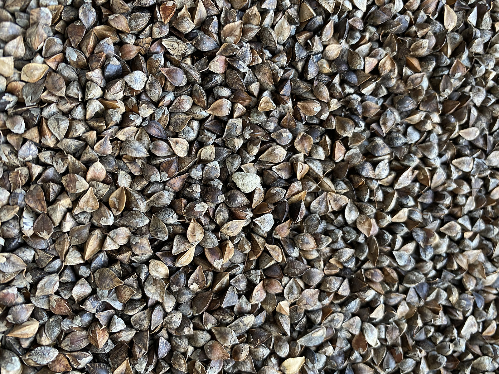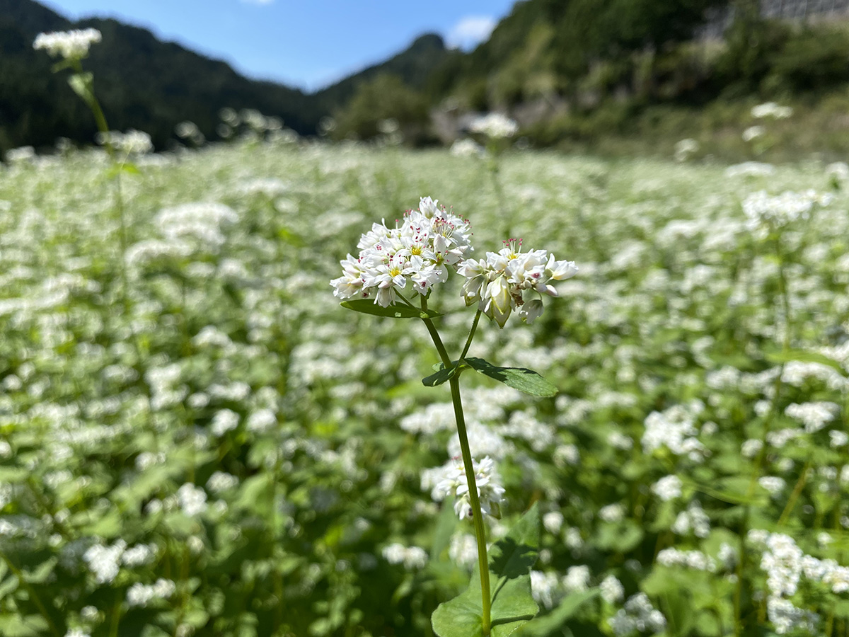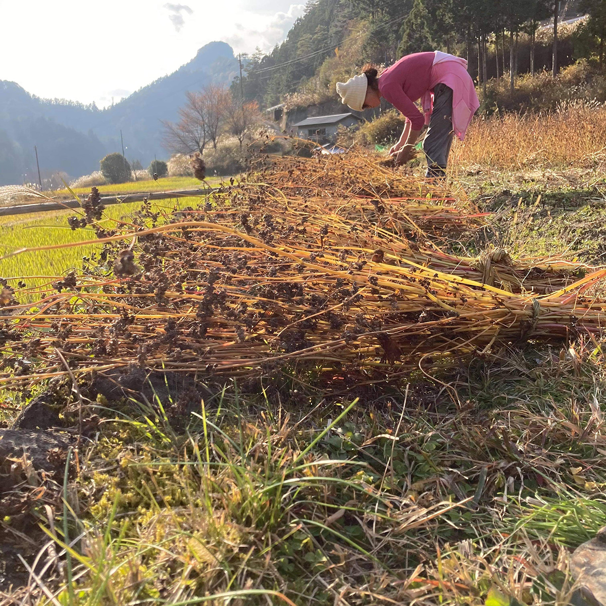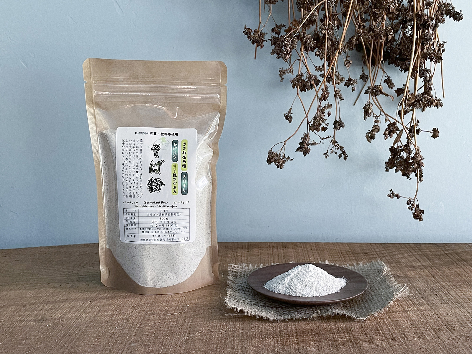 木沢いづりはで種がつながれ、毎年大切に育まれてきた在来種そばを、農薬や肥料を使わずに栽培しました。夏のお盆ごろに種を蒔くと、数日でかわいい芽が出て、初秋には白い可憐なそば花畑に。11月頃に手刈りで収穫し天日干しした後、叩いて実を落とします。唐箕(とうみ)で不要なものを取り除いたそばの実を、殻がついたまま石臼でゆっくり挽いて、手作業で丁寧に作ったそば粉です。殻ごと挽いたそば粉には、黒いホシが入り、昔から親しまれている香りのよい粉になります。