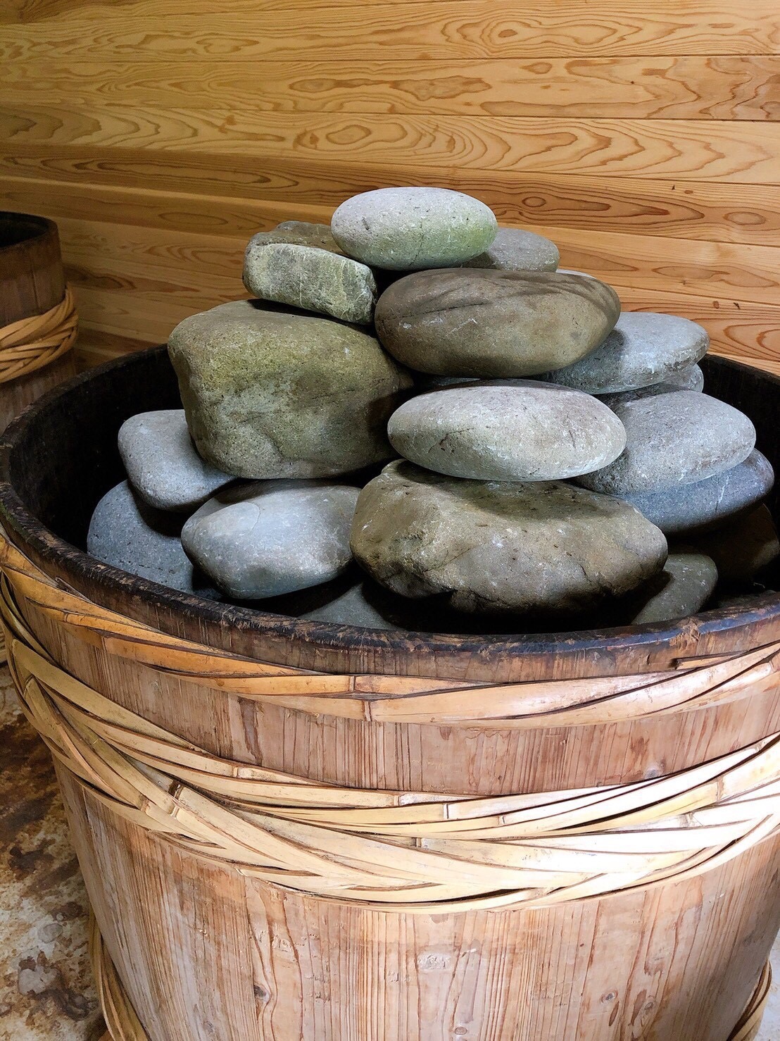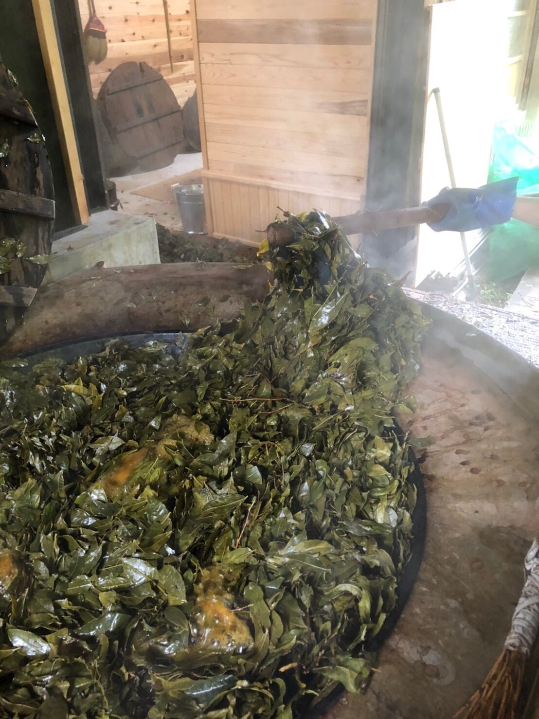 柔らかい新芽を摘み取る茶摘みとは違い、徳島県那賀町に伝わる晩茶は、真夏の暑い時期に固く大きく育ちきった葉を摘み(刈り)ます。その理由は、摘んだ茶葉を大きな釜で湯がいて揉み込むため。その後、空気が入らないように踏み固めながら、代々受け継がれた木桶に湯がいた葉を敷き詰めます。重石をのせ、微生物乳酸菌発酵をさせること約2週間。頃合いをみて、木桶から出した葉を炎天下のなか天日に干して乾燥させ完成。